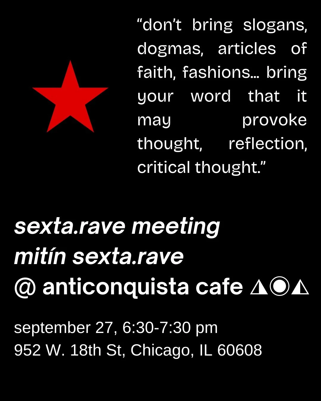 Meet at Anticonquista Café in Pilsen at 5:00pm and we’ll roll at 5:30pm. All allies are welcome to hang at Anticonquista while they’re open!
